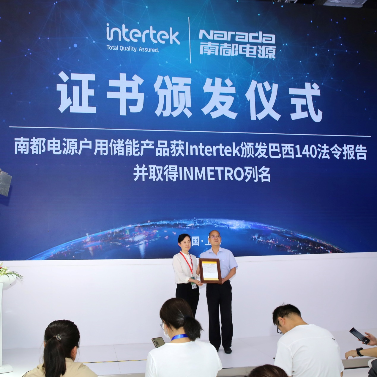在展台发布区,全球领先的质量和安全服务机构INTERTEK受邀,为710公海寰宇NESR系列户用储能产品颁发INMETRO证书。证书的获得为该产品顺利进入巴西市场提供了强有力的安全保障。